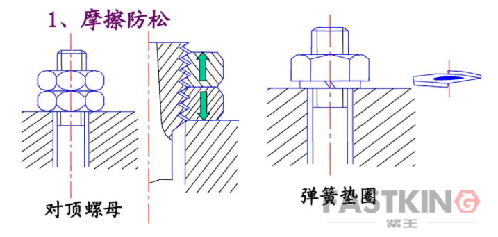 第一種是摩擦防松。這是應(yīng)用最廣的一種防松方式,這種方式在螺紋副之間產(chǎn)生一不隨外力變化的正壓力,以產(chǎn)生一可以阻止螺紋副相對轉(zhuǎn)動的摩擦力。這種正壓力可通過軸向或同時兩向壓緊螺紋副來實(shí)現(xiàn)。如采用彈性墊圈、雙螺母、自鎖螺母和尼龍嵌件鎖緊螺母等。這種防松方式對于螺母的拆卸比較方便,但在沖擊、振動和變載荷的情況,一開始螺栓會因松弛導(dǎo)致預(yù)緊力下降,隨著振動次數(shù)的增加,損失的預(yù)緊力緩慢地增多,最終將會導(dǎo)致螺母松脫、螺紋聯(lián)接失效。